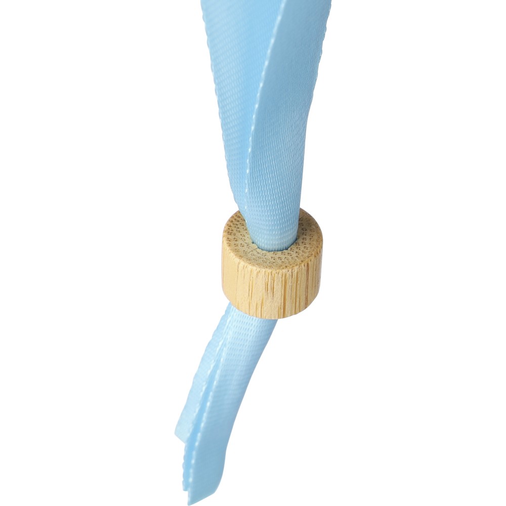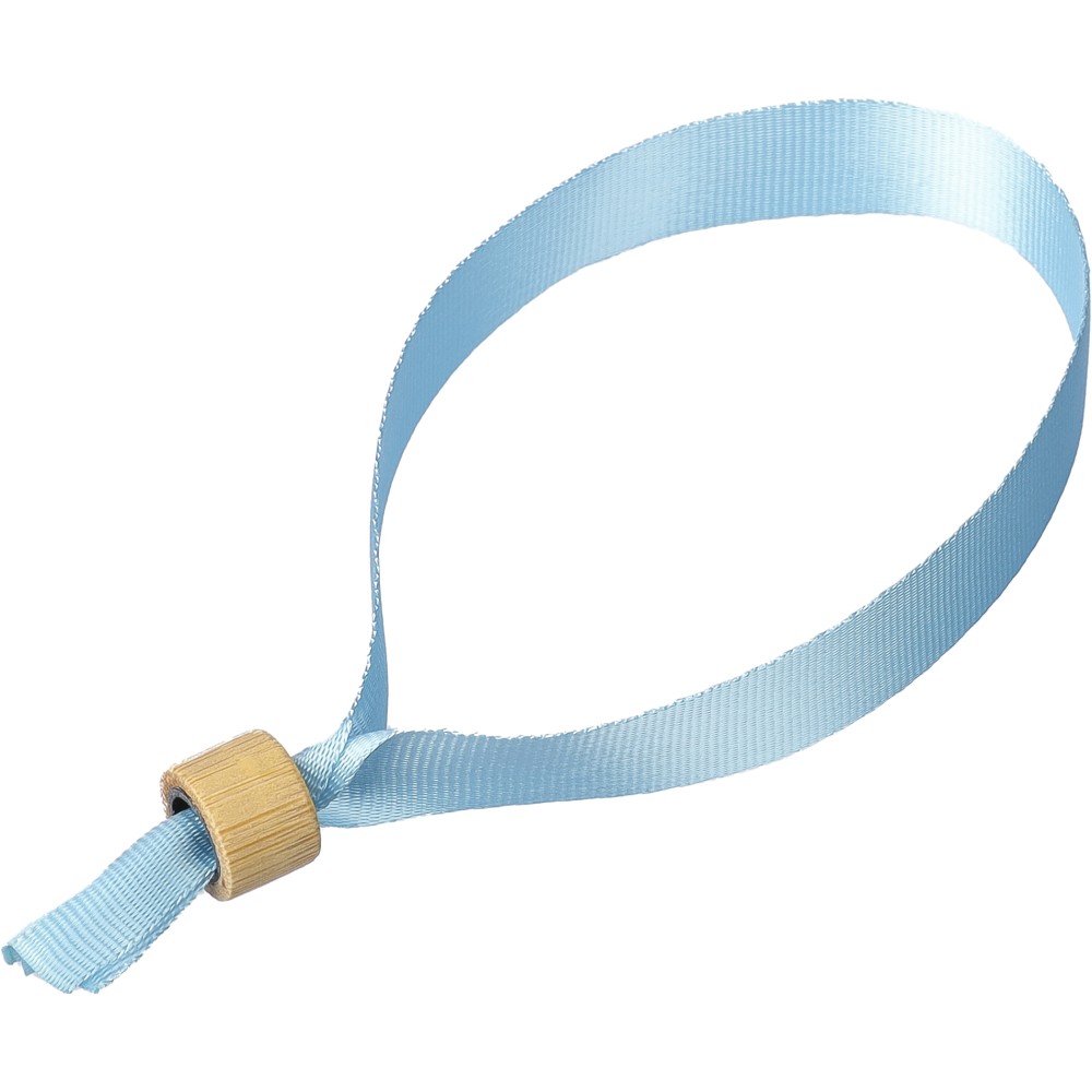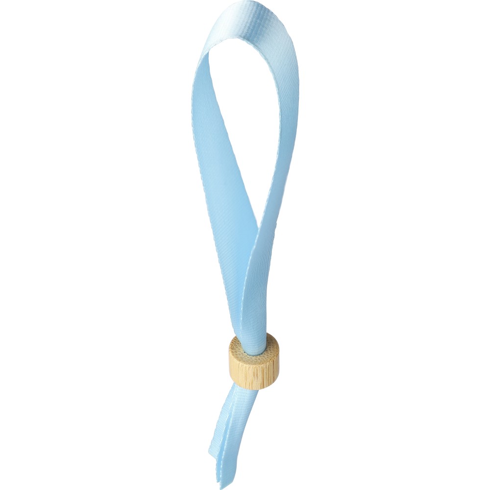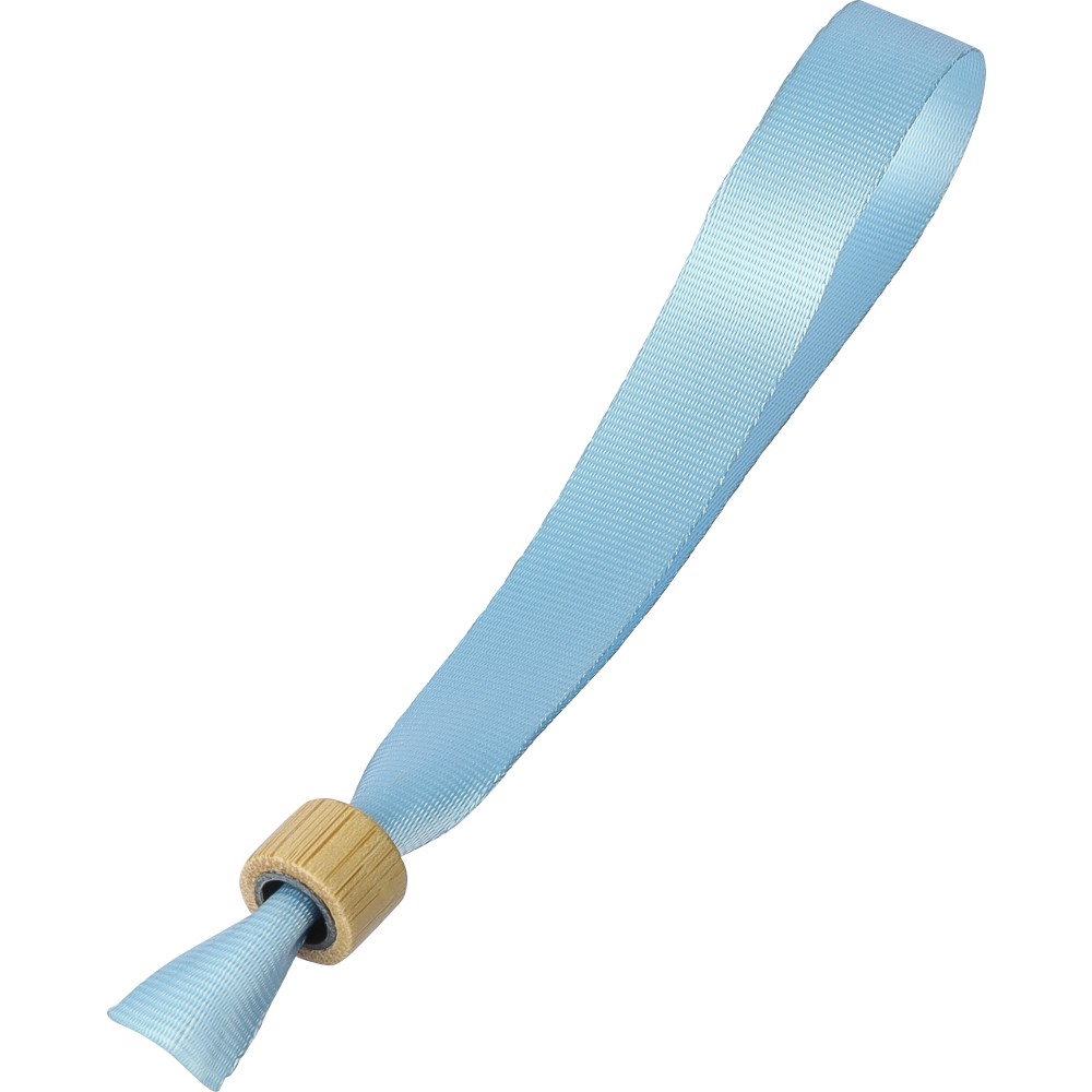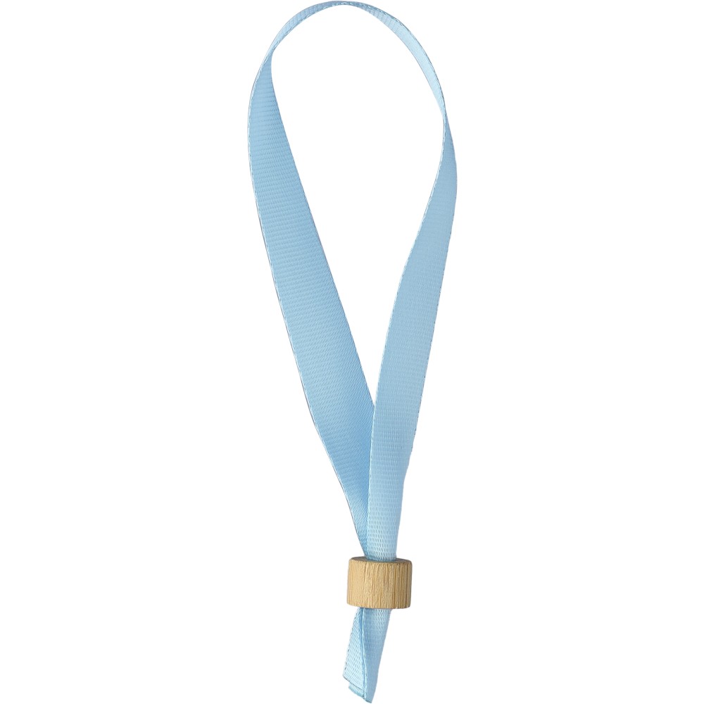 300D rPET karszalag bambusz hengerzárral. Hosszúság: 34 cm, szélesség: 1.5 cm. Emblémázás: Szitanyomás