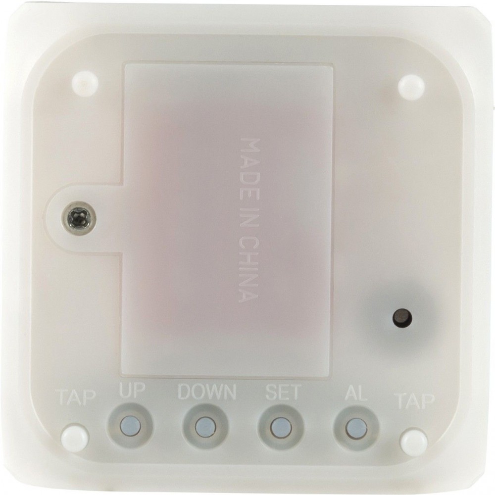 Kocka alakú ébresztőóra változó színű fénnyel. Funkciói: óra, naptár, hőmérő. Az elemet tartalmazza. HIPS műanyag. Emblémázás: Tamponnyomás, UV nyomtatás