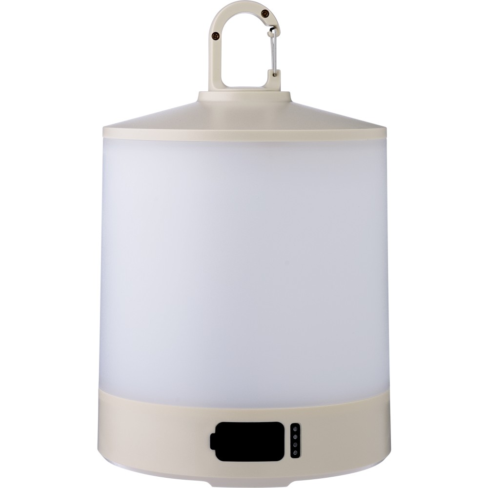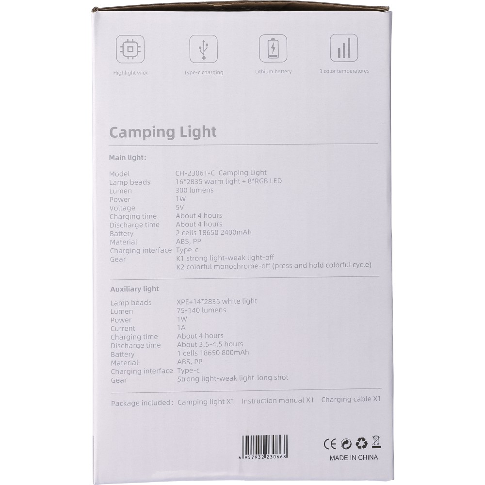 Multifunkciós lámpa kempingezéshez. Levehető elemlámpával, karabinerrel, 4 világítási móddal. 8-féle színben világít, melyek közül a fehér kétféleképpen is működtethető. A másik 7 szín váltakozóra is beállítható a gomb nyomvatartásával. Az elemlámpa 800 mAh-s, a kempinglámpa 2400 mAh-s akkumulátorral rendelkezik. C-típusú csatlakozók. Csomagolása papírdoboz. Emblémázás: Tamponnyomás