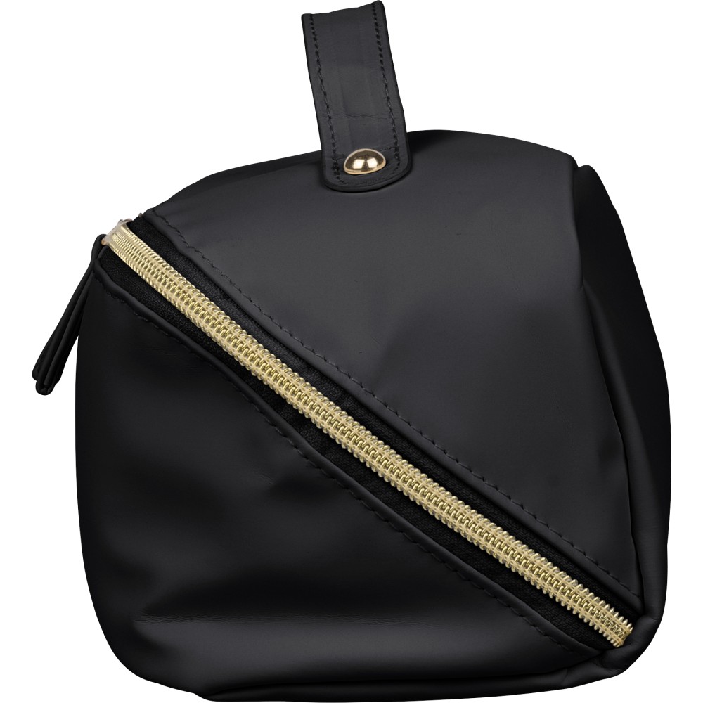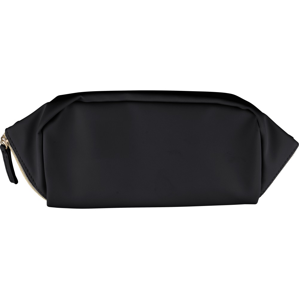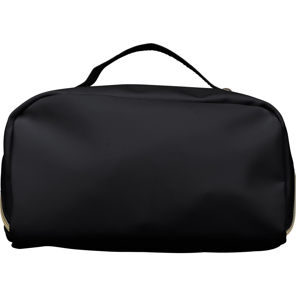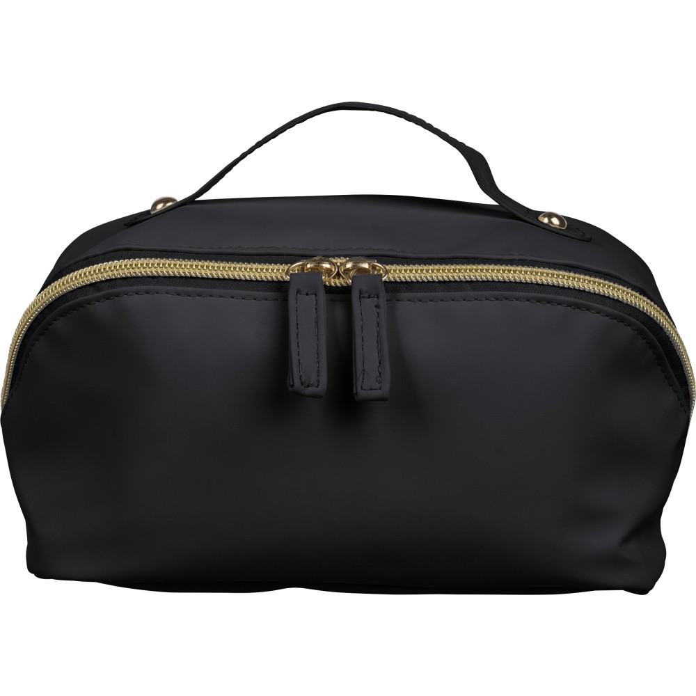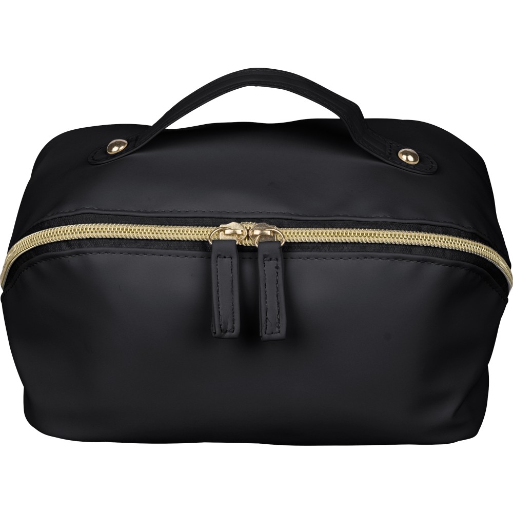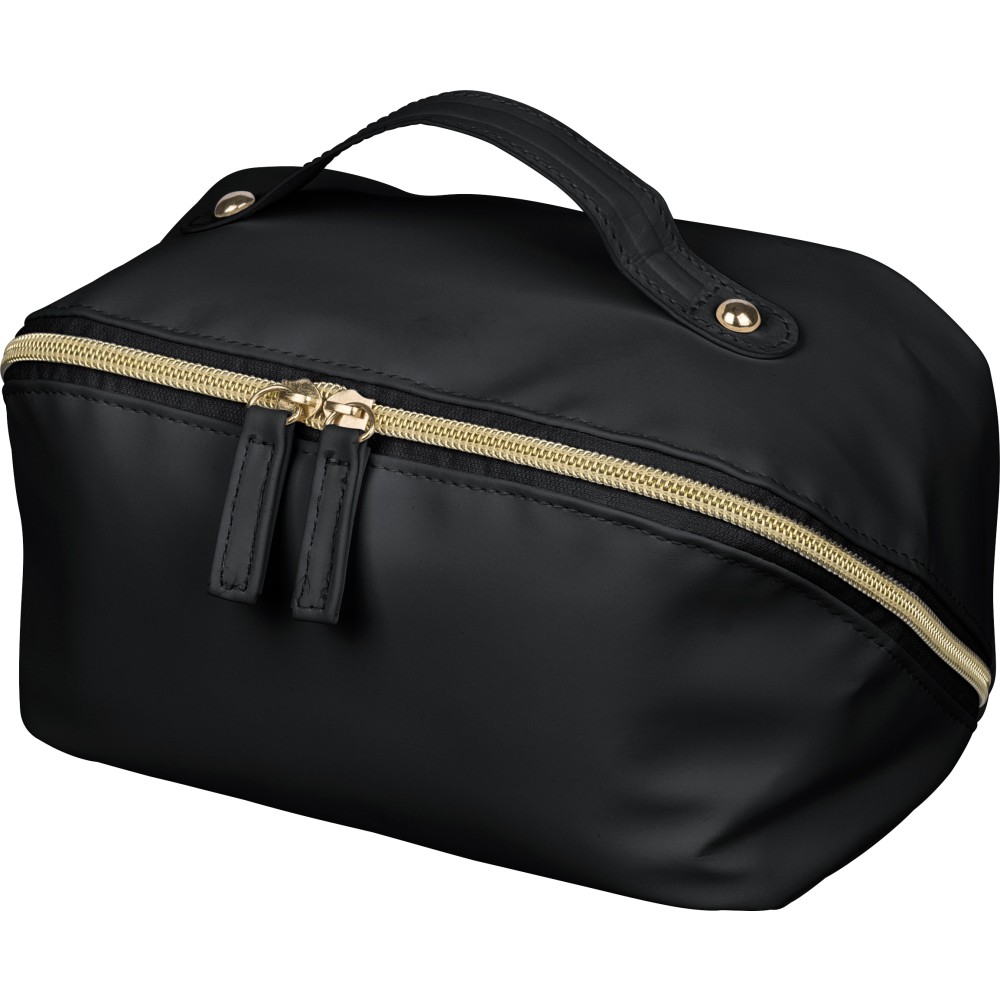 Újrahasznosított PU anyagból készült neszesszer középen elhelyezett cipzárral a széles nyithatóság érdekében. Rövid fogantyúval, tágas belső térrel és négy rekesszel, beleértve egy belső cipzáras zsebet. 210D újrahasznosított béléssel készült, belsejében egy újrahasznosított alapanyagra utaló címkével.