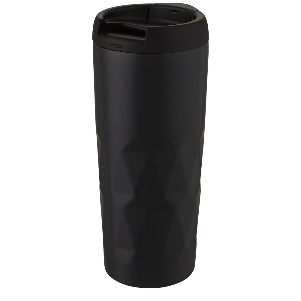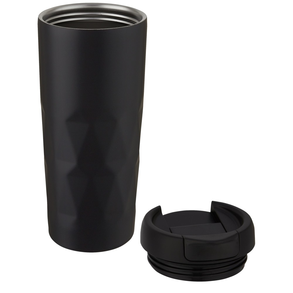 Duplafalú réz vákuumszigetelt pohár csavaros szivárgásmentes fedéllel, kifinomult geometriai kialakítással. A szigetelt 18/8-as rozsdamentes acél több órán keresztül melegen vagy hidegen tartja az italokat. BPA-mentes, a német élelmiszerbiztonsági törvény (LFGB) szerint tesztelt és jóváhagyott, és a REACH előírásai szerint ftaláttartalomra tesztelve. Űrtartalma 450 ml. Kézi mosogatása javasolt. Újrahasznosított karton díszdobozban. Emblémázás: Gravírozás, Tamponnyomás