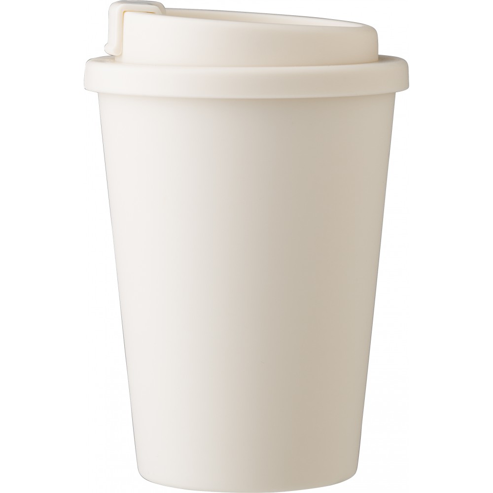 Kávéspohár csavaros fedéllel és felpattintható ivórésszel. Jó hőtartó, hideg és meleg italokhoz is használható. Űrtartalom: 350 ml. PP műanyag. Emblémázás: Körszita, Tamponnyomás
