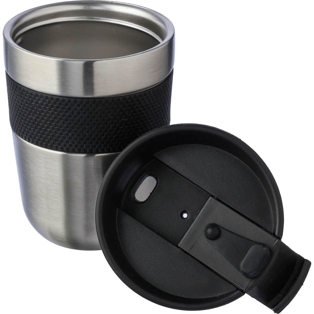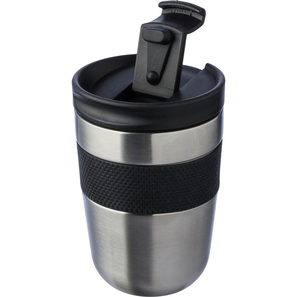 Duplafalú bögre PP fedéllel és szilikon fogóval. A tartalmát 4 órán át melegen és 6 órán át hidegen tartja. A belső rész 304-es rozsdamentes acélból, a külső rész 201-es rozsdamentes acélból készült. Egyenként barna kartondobozba csomagolva. Űrtartalom: 300 ml. Emblémázás: Gravírozás