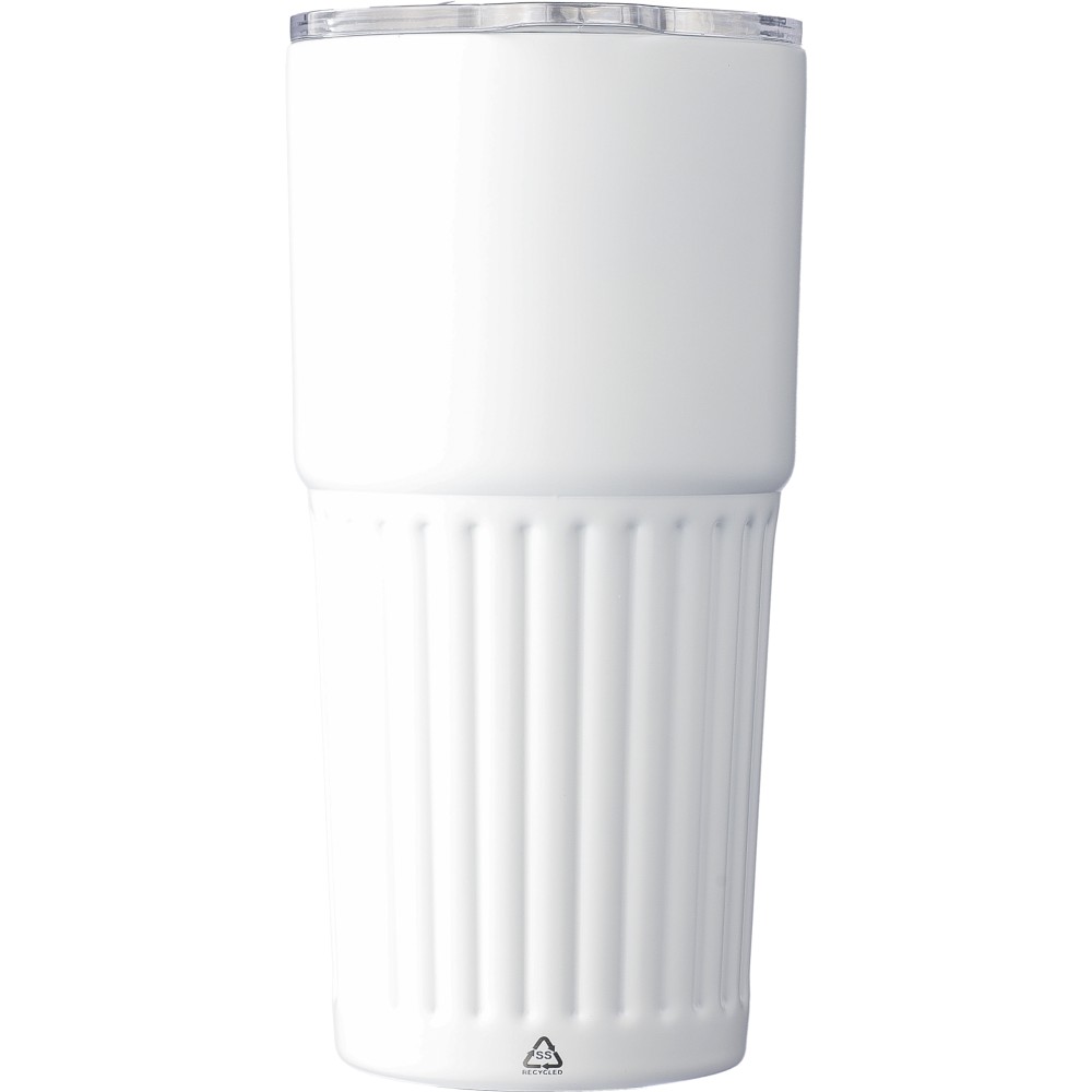 Újrahasznosított rozsdamentes acél útibögre, 450 ml. A belső 304-es, a külső 201-es rozsdamentes acélból készült, bordás markolattal, műanyag, csúszózáras fedéllel. Gravírozott újrahasznosított logó található a bögrén. Csomagolása barna papírdoboz. Emblémázás: Körszita
