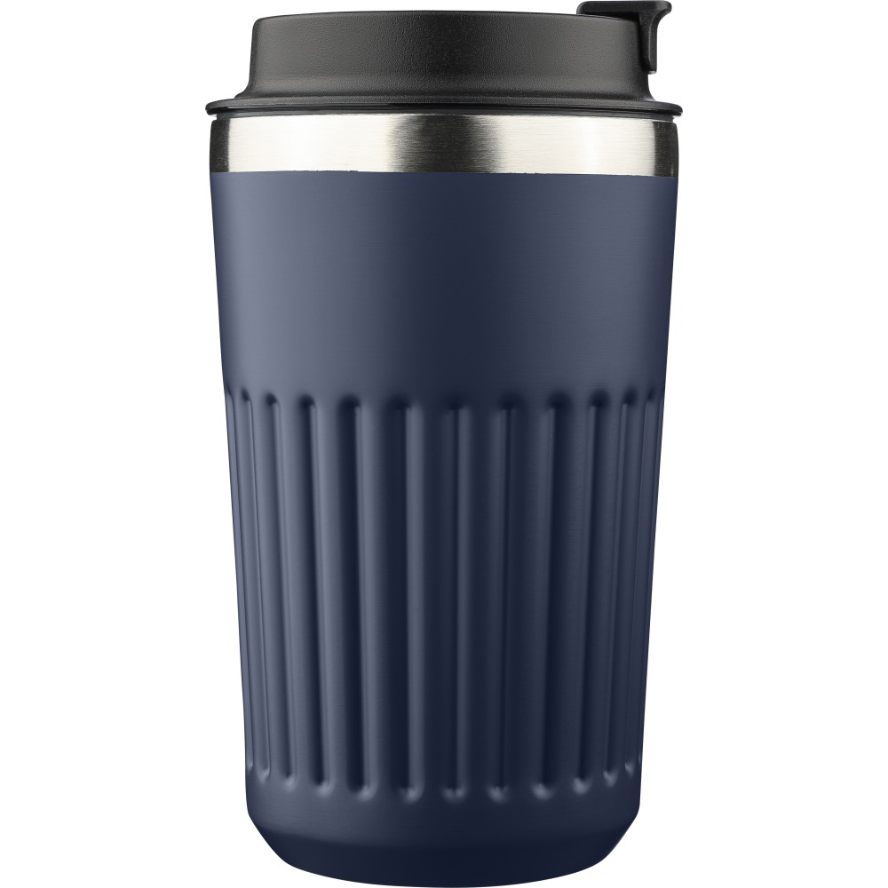 Újrahasznosított rozsdamentes acélból készült utazópohár 400 ml űrtartalommal, duplafalú kialakítással és külső bordázott felülettel. Belső része 304-es, külső része 201-es rozsdamentes acél, PP fedéllel. A pohártesten gravírozott recycled (újrahasznosított) alapanyagra utaló logó található. Darabonként barna kartondobozba csomagolva. Emblémázás: Gravírozás, Tamponnyomás