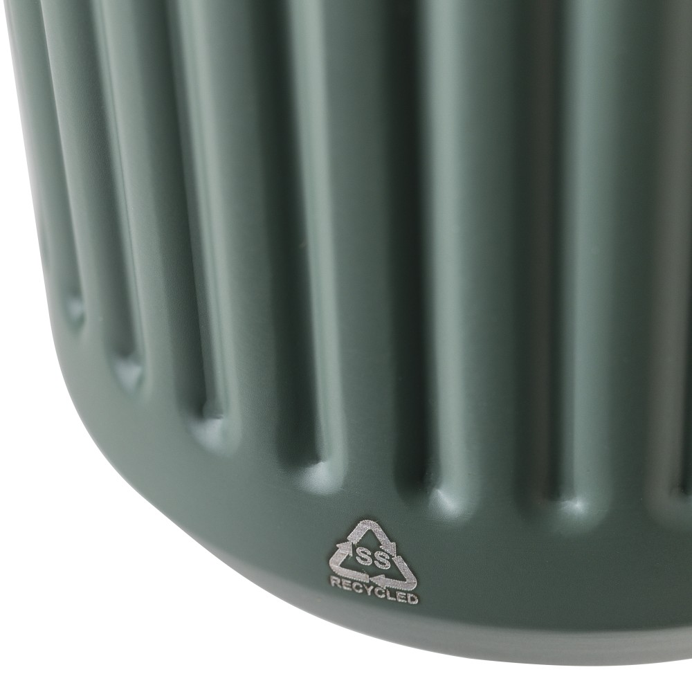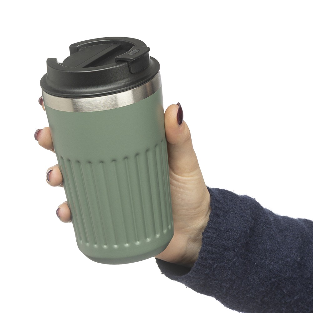 Újrahasznosított rozsdamentes acélból készült utazópohár 400 ml űrtartalommal, duplafalú kialakítással és külső bordázott felülettel. Belső része 304-es, külső része 201-es rozsdamentes acél, PP fedéllel. A pohártesten gravírozott recycled (újrahasznosított) alapanyagra utaló logó található. Darabonként barna kartondobozba csomagolva. Emblémázás: Gravírozás, Tamponnyomás