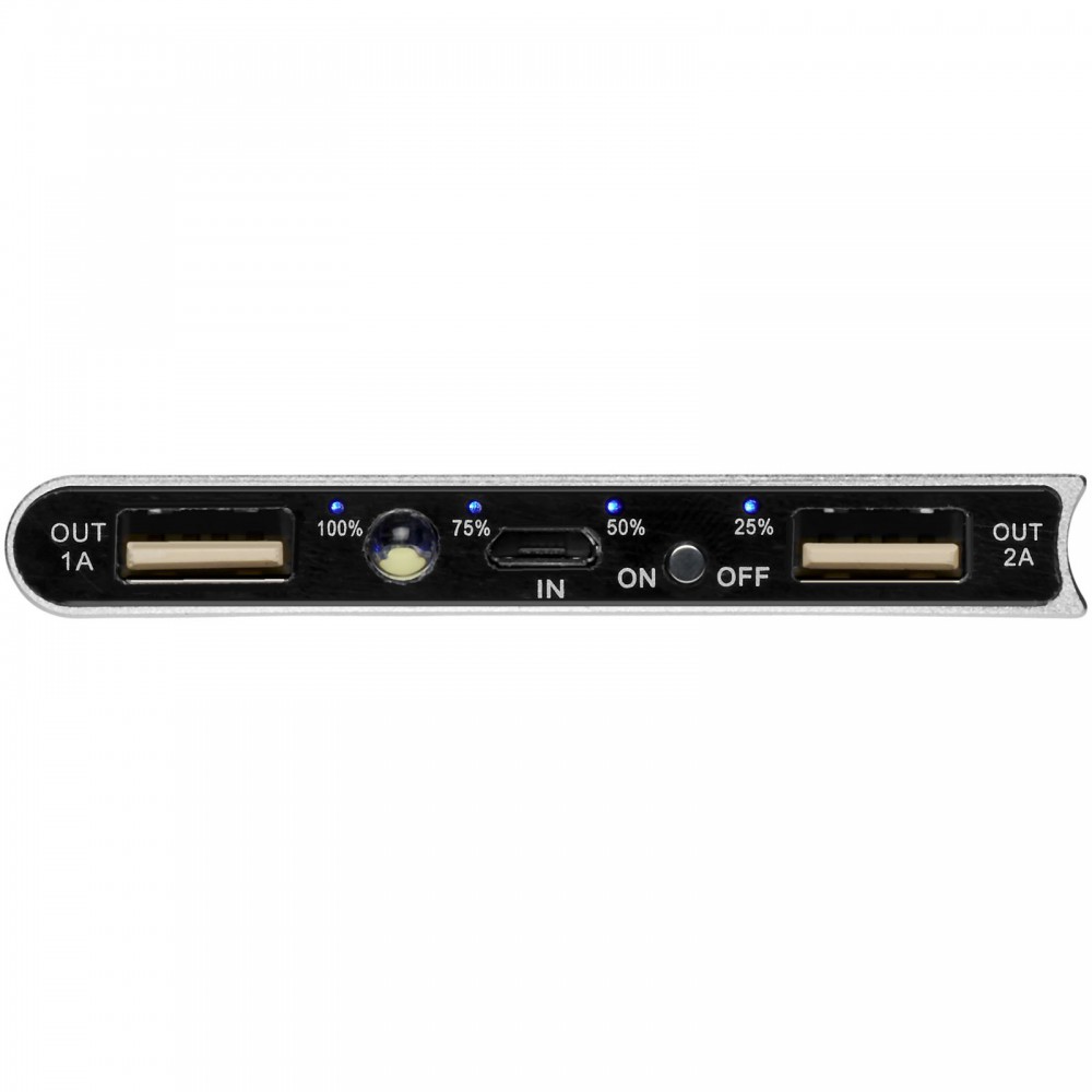 Powerbank 8000 mAh teljesítménnyel. Alumínium. Veszélyes áru, csomagban nem küldhető. A Plate 8000 mAh alumínium power bank 8000 mAh A osztályú lítium-polimer akkumulátorral rendelkezik, és vékony kialakítású. A LED jelzőfény töltés közben kigyullad, és kijelzi az akkumulátor kapacitását az akkumulátorban. 5V/2A bemeneti és kimeneti feszültséggel rendelkezik, és tartós alumíniumból készült. USB-Micro-USB töltőkábelt tartalmaz. Fehér Avenue díszdobozban szállítjuk. Emblémázás: Gravírozás, Tamponnyomás, UV nyomtatás