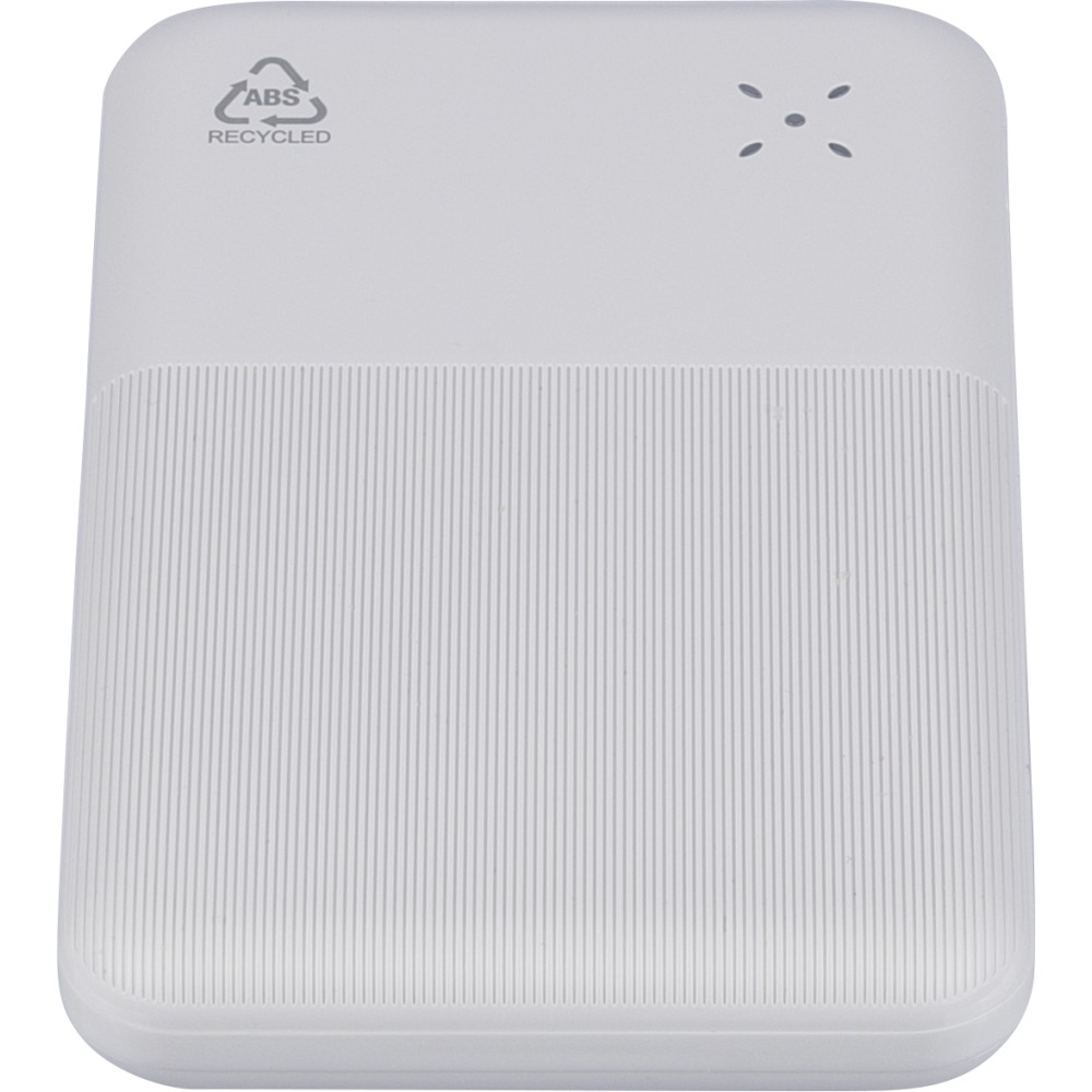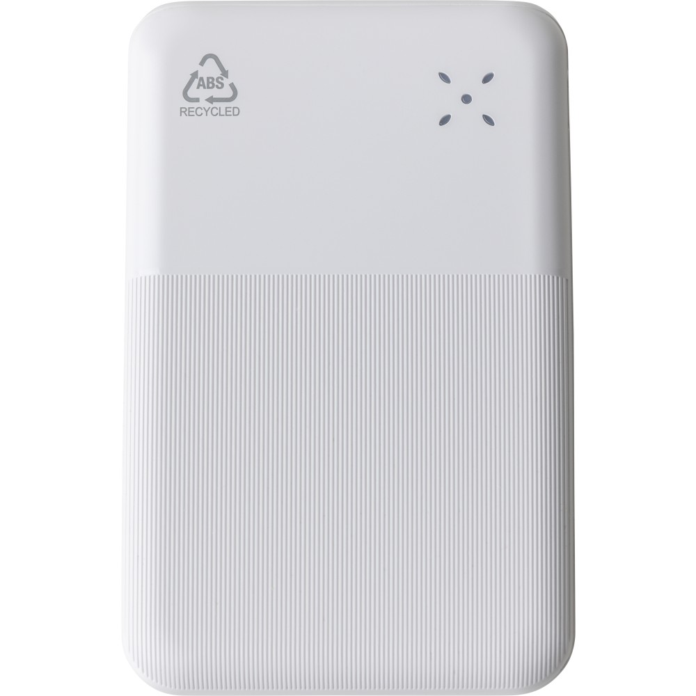 Újrahasznosított ABS anyagból készült powerbank 10 000 mAh kapacitással és 22,5 W gyors töltési teljesítménnyel. Type-C in/out és Type-A bemenettel, digitális kijelzővel, sima és texturált felülettel. Biztonsági védelmekkel ellátva. A hátoldalon gravírozott recycled (újrahasznosított) alapanyagra utaló logó található. Selyempapírral bélelt barna dobozba csomagolva. Emblémázás: UV nyomtatás