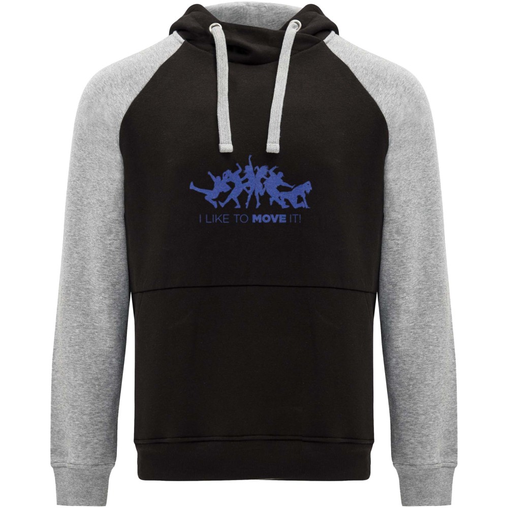 Két színű uniszex kapucnis pulóver. Kapucni keresztezett nyakrésszel és fém kiegészítőkkel. Kontrasztos belső rész a kapucnin, húzózsinór és raglán ujjak. Kenguru zseb. Rugalmas 1x1 passzék és alj. Levehető címke. Emblémázás: Hímzés, Szitanyomás
