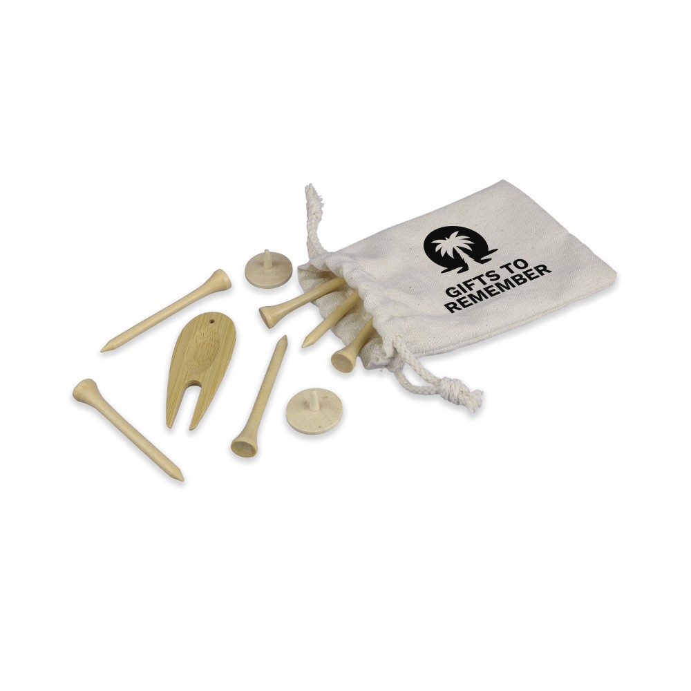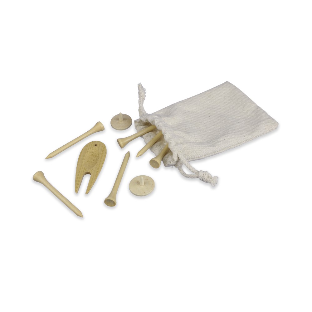 Fa golf tee készlet 6 db tee-vel, 1 db bambusz pitch-villával és db fa jelölővel. Vászontasakba csomagolva. Emblémázás: Szitanyomás