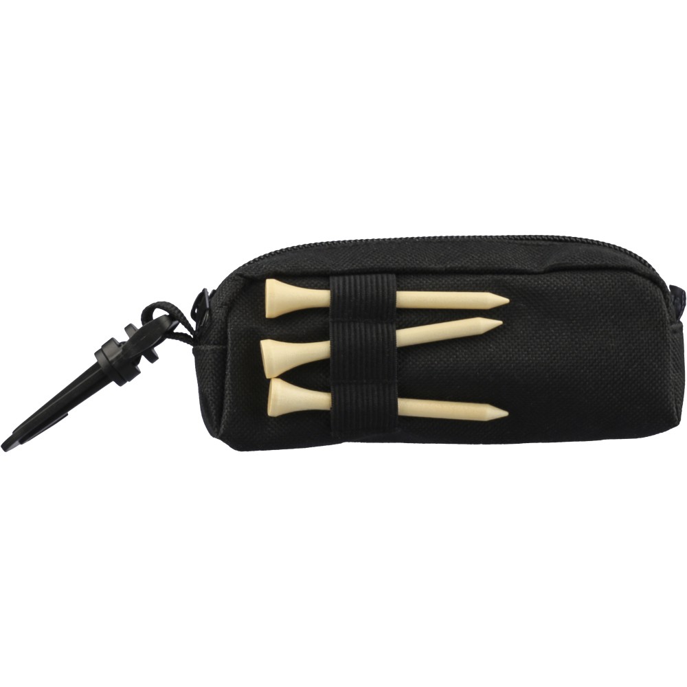 RPET anyagból készült, cipzáras tasakban elhelyezett golfkészlet PP karabinerrel, 3 gyakorló golflabdával és 3 darab bükkfából készült golftee-vel. A tasakon rPET címke található