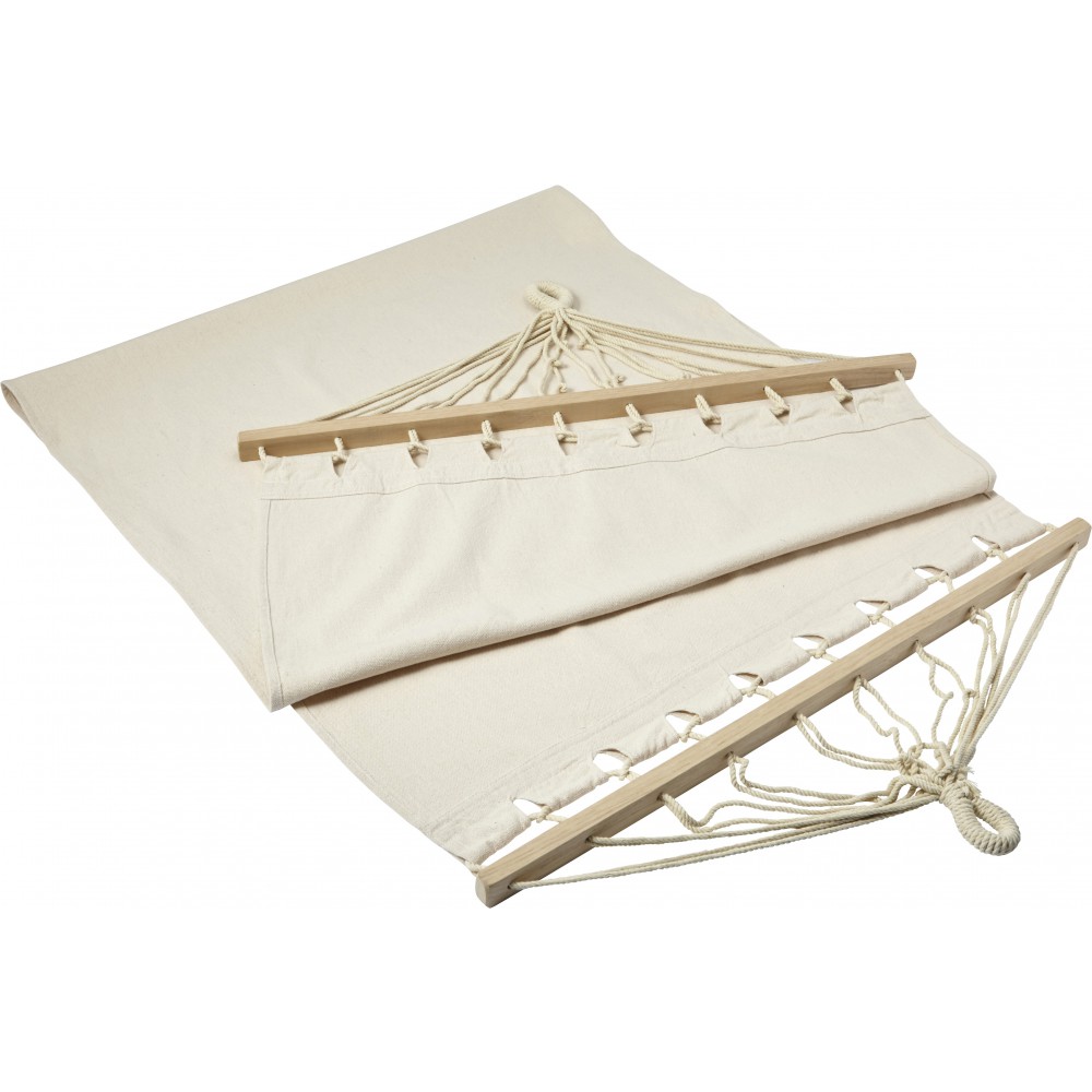Függőágy fa vázzal, táskában. Teherbírás: 150 kg. Poliészter vászon. Emblémázás: Szitanyomás