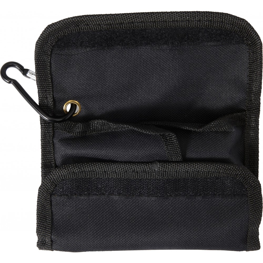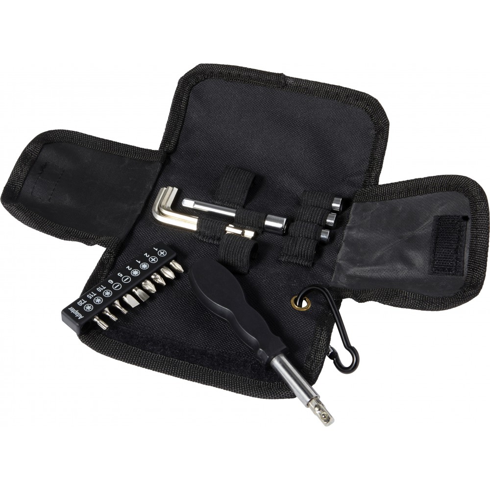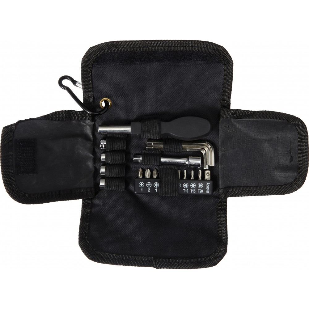 20 darabos szerszámkészlet 600D oxford anyagú tartóban, tépőzáras záródással, karabineres akasztóval. A táska tartalma: csavarhúzó, 3 db hex kulcs, 4 db befogófej, 10 db csavarhegy, 1 db hosszabbító nyél. Emblémázás: Szitanyomás