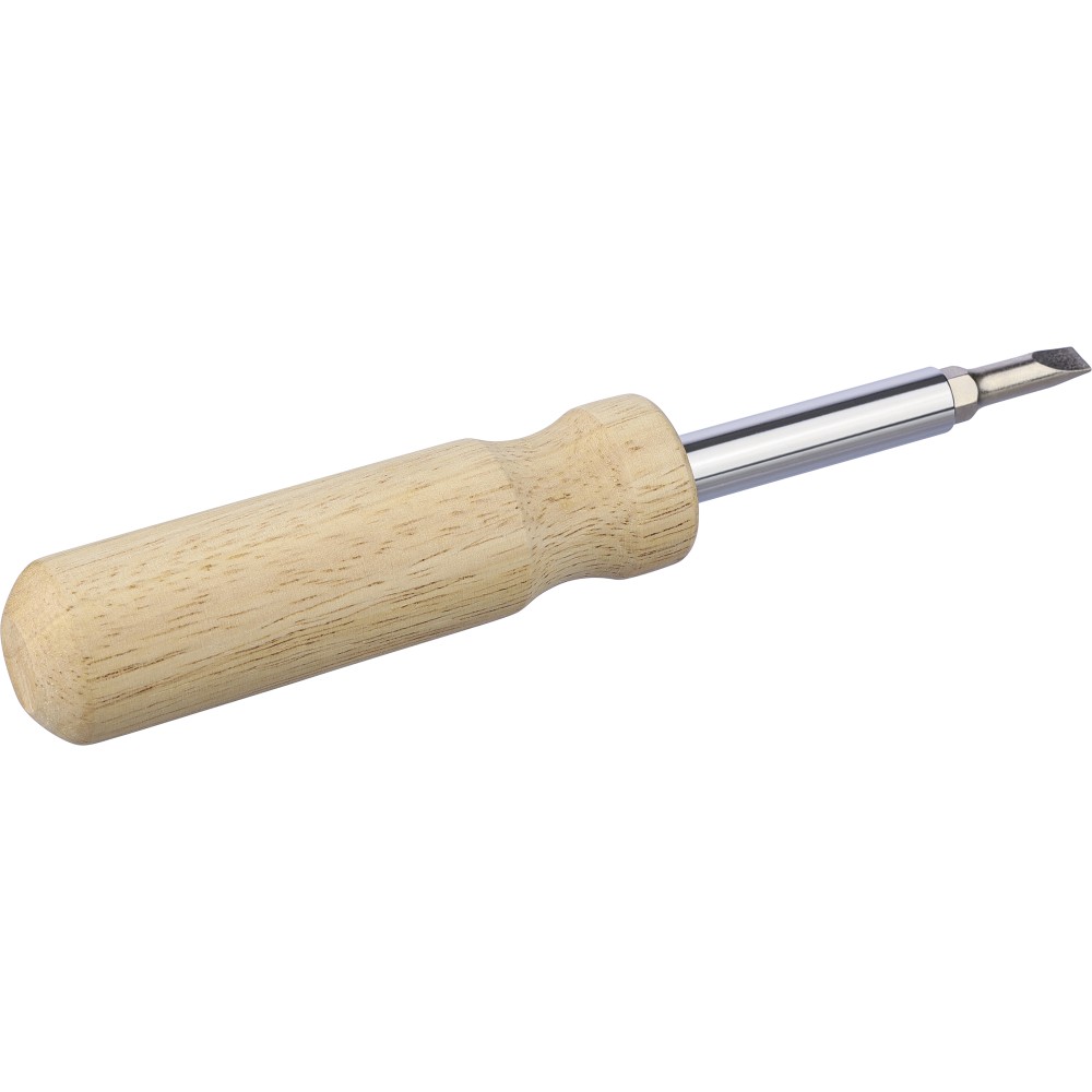 Kaucsukfa csavarhúzókészlet a nyélben tartható 4 db mágneses fejjel (2-2 db mindegyik kétoldalas hegyen). Praktikus és kompakt kialakítás cserélhető fejekkel és tartóval. Csomagolása barna papírdoboz. Emblémázás: Gravírozás