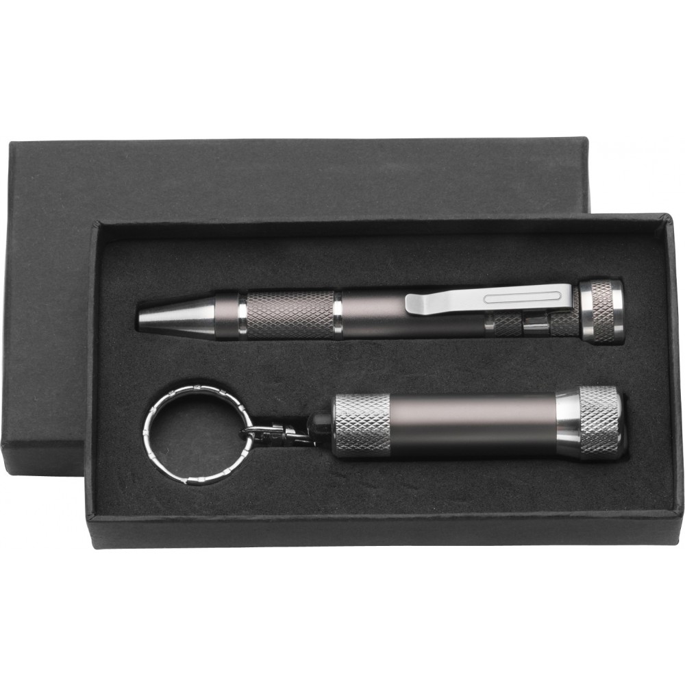 Tartalma: toll alakú csavarhúzó, 4 db sima csavarhúzó, 4 db csillagcsavarúzó fej, 3 LED-es zseblámpa és kulcstartó. Az elemet tartalmazza. Emblémázás: Gravírozás, Tamponnyomás