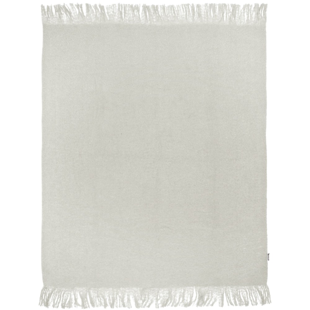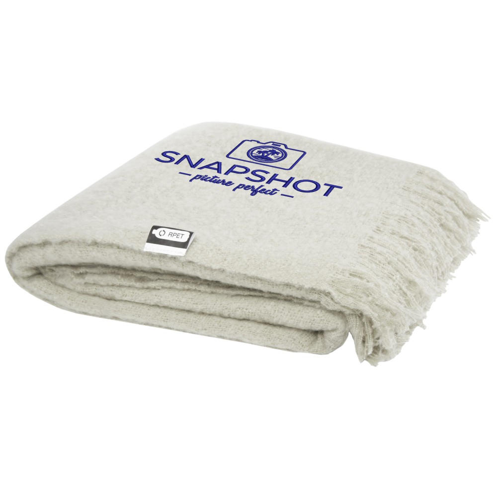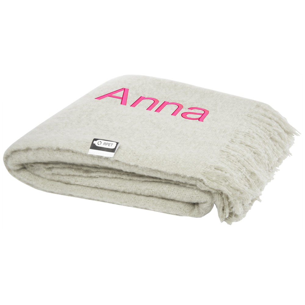 Ultrapuha újrahasznosított PET-ből készült moher takaró összefogó pánttal. A rojtok hossza: 10 cm mindkét végén. Összefogó szalag mérete: 72 x 4 cm. 215 g/m2. Emblémázás: Hímzés
