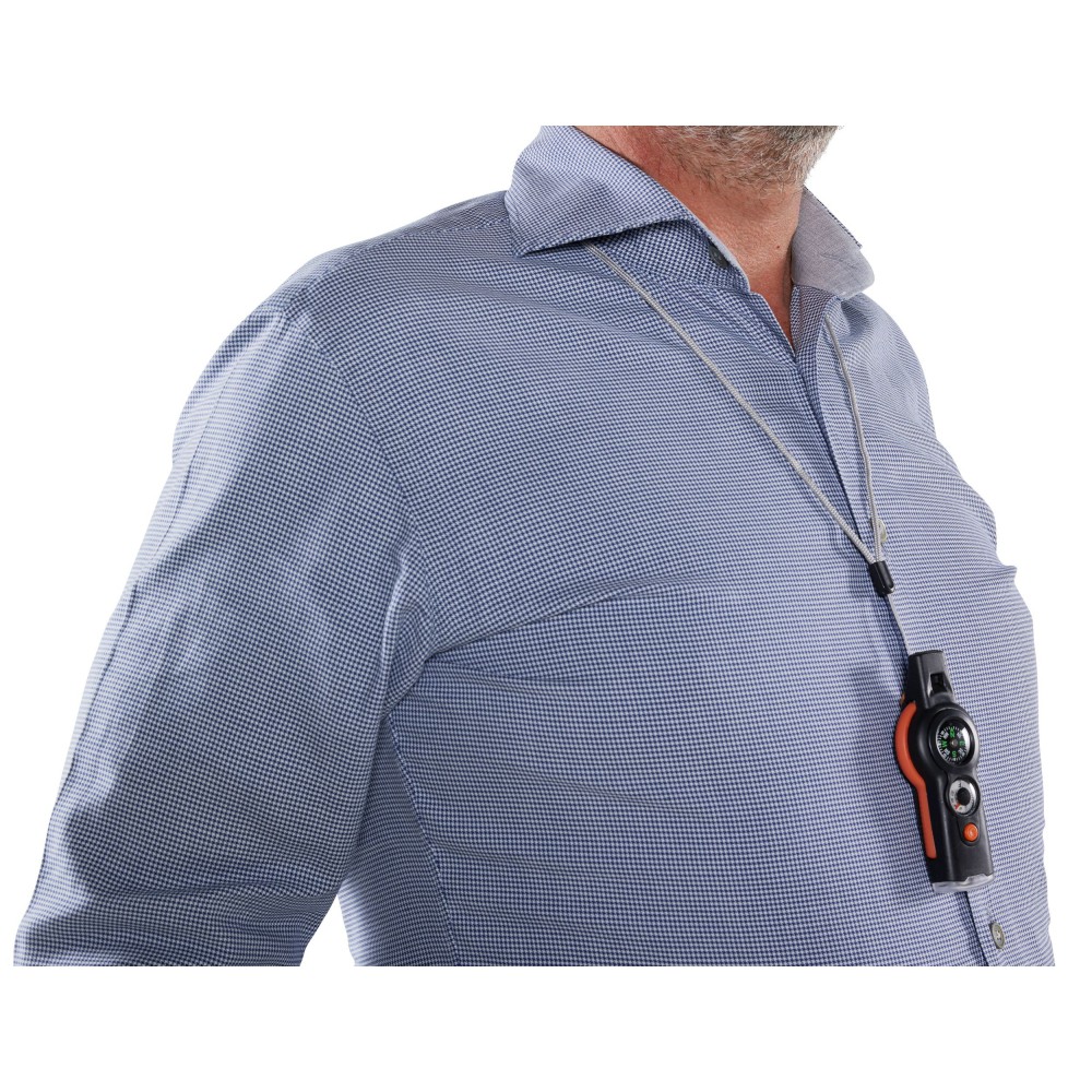 Többfunkciós túlélőeszköz. Az eszköz a következőket tartalmazza: síp, iránytű, hőmérő (° C és ° F), lámpa, tükör, nagyító és zsinór biztonsági zárral. ABS műanyag. Emblémázás: Tamponnyomás