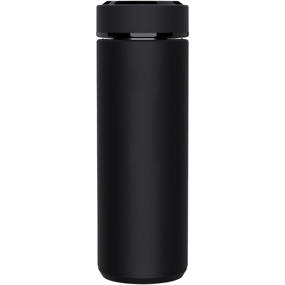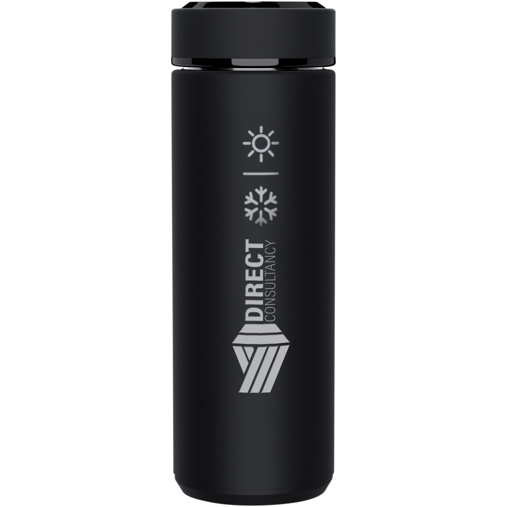Duplafalú 500 ml-es szigetelt, rozsdamentes palack antibakteriális kezeléssel és hőmérséklet-érzékelővel. A Touch & Light rendszernek köszönhetően az ital hőmérséklete megjelenik a palack kupakján (Celsius fokban). Meleg és hideg italokhoz egyaránt alkalmas. Újrahasznosított papírból készült, hengeres díszdobozban szállítjuk. Mérete: d: 47 x 225 mm. Elem: CR 2450 (3V). Az akkumulátor nem cserélhető. 20 000-szer képes megjeleníteni a hőmérsékletet. Emblémázás: Gravírozás, Körszita