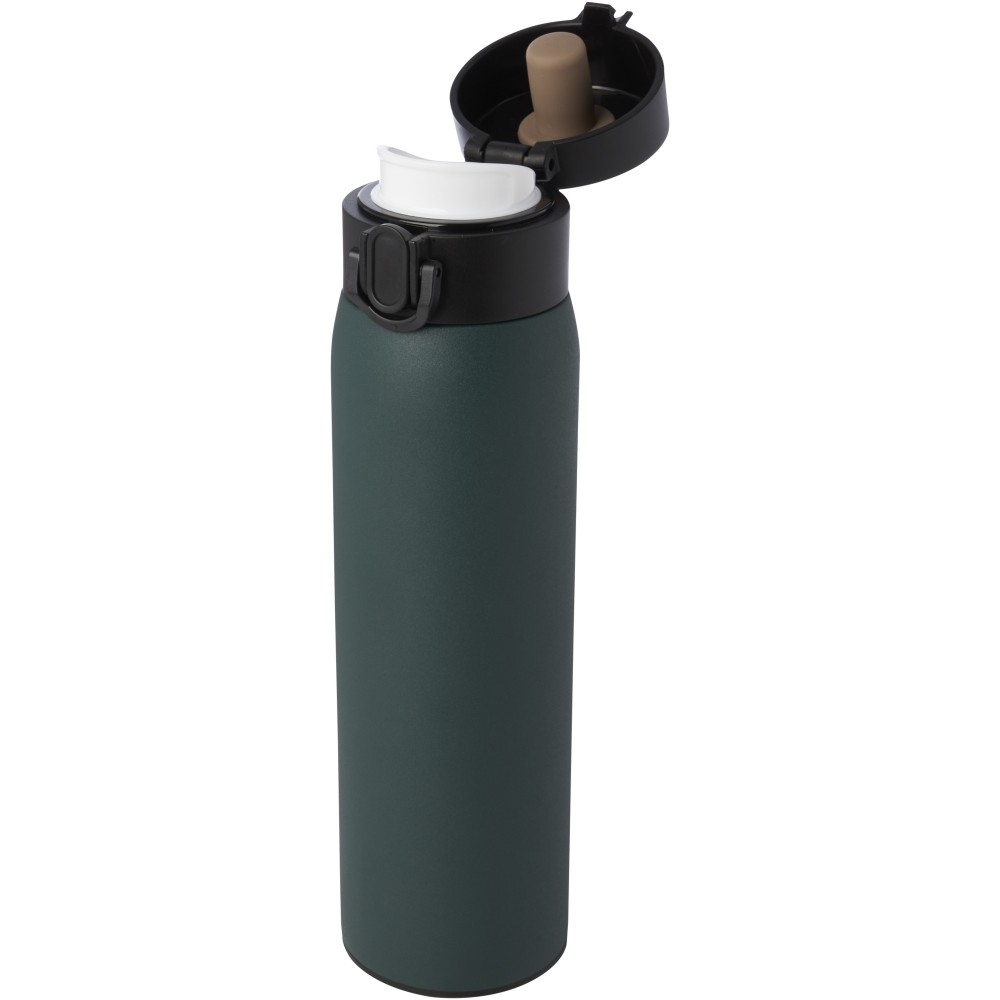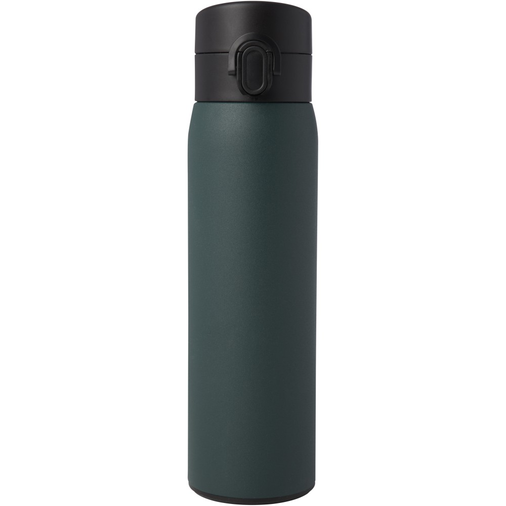 Stílusos, RCS tanúsítvánnyal rendelkező újrahasznosított rozsdamentes acélból készült, szigetelt palack gombos nyitómechanizmussal. A flaska szivárgásmentes és a réz vákuumszigetelésnek köszönhetően az italokat több órán keresztül forrón vagy hidegen tartja. Űrtartalom: 450 ml. Újrahasznosított kartonból készült díszdobozban szállítjuk. Emblémázás: Gravírozás