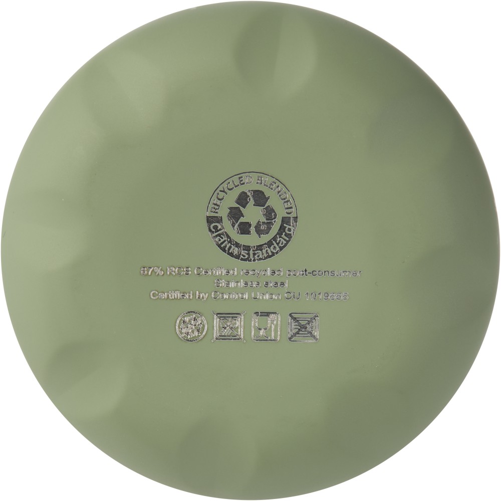 Vákuumszigetelt, RCS tanúsítvánnyal rendelkező, újrahasznosított rozsdamentes acél palack ikonikus dizájnnal, amely több órán keresztül tartja melegen vagy hidegen az italokat. A legtöbb pohártartóba illeszkedő talppal ellátott, elegáns megjelenésű vizes palack tökéletes promóciós termék. A német élelmiszer-biztonsági jogszabályok (LFGB) szerint, valamint a REACH-szabályozásnak megfelelően ftalát-tartalomra tesztelt és jóváhagyott. Űrtartalma: 500 ml. Újrahasznosított kartonból készült díszdobozban szállítjuk. Emblémázás: Bögredekor, Gravírozás
