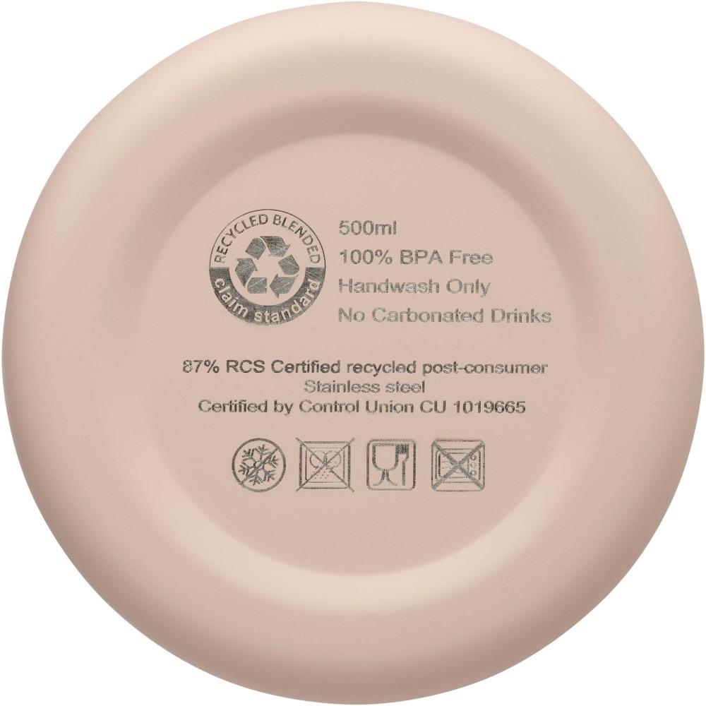 Rézvákuum szigetelésű, RCS tanúsítvánnyal rendelkező rozsdamentes acél palack letisztult dizájnnal. Az szigetelt rozsdamentes acél szerkezet megakadályozza a kondenzációt a palack belsejében, és a trendi matt porfestett felület extra tartóssá teszi. BPA-mentes, német élelmiszerbiztonsági jogszabály (LFGB) szerint tesztelt és jóváhagyott. Ftalát-tartalom szerint REACH szabályozásoknak megfelelően tesztelt és jóváhagyott. Űrtartalom: 500 ml. Kézi mosogatás javasolt. Újrahasznosított kartondobozban szállítjuk. Emblémázás: Bögredekor, Gravírozás