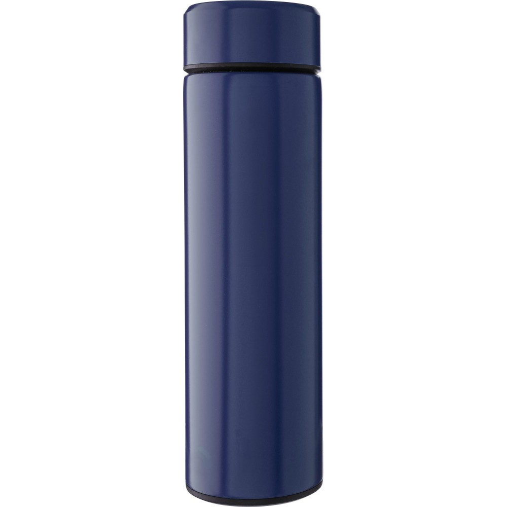 Duplafalú palack beépített, kivehető teaszűrővel. A belső rész 304-es rozsdamentes acélból, a külső rész 201-es rozsdamentes acélból készült. Egyenként barna kartondobozba csomagolva. Űrtartalom: 425 ml. Emblémázás: Gravírozás, Tamponnyomás