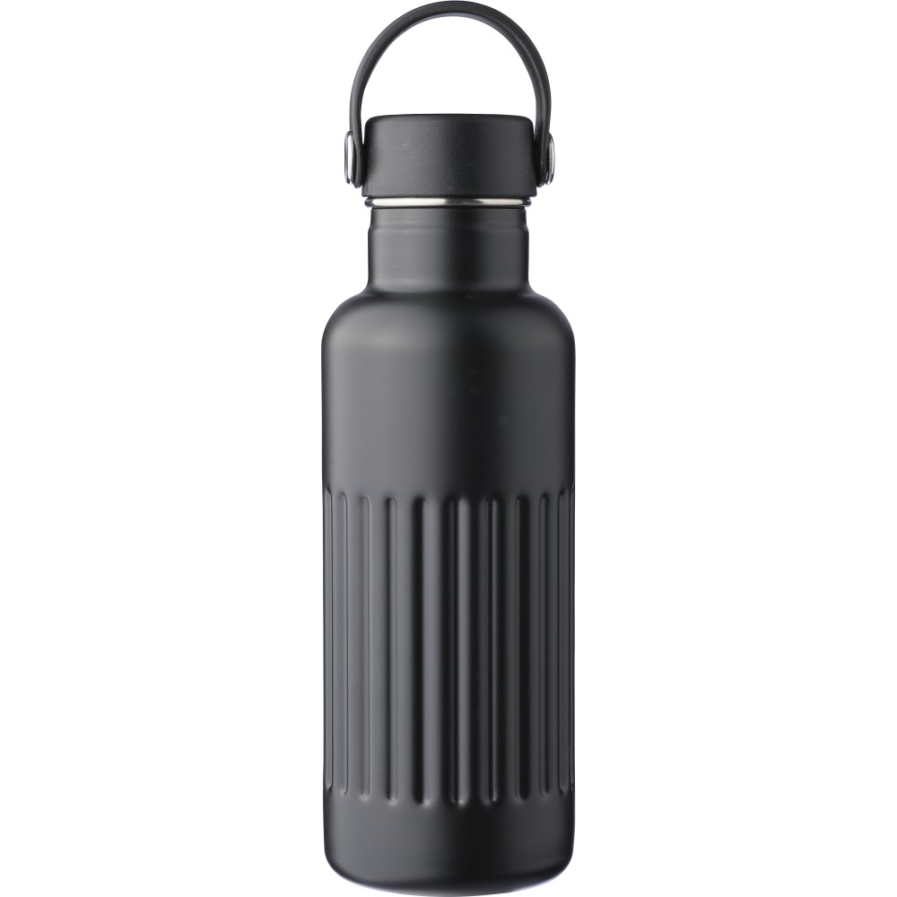 Újrahasznosított rozsdamentes acél termosz, 500 ml. A belső 304-es, a külső 201-es rozsdamentes acélból készült, bordás markolattal, PP és fém fedéllel, műanyag hordozófüllel. Gravírozott újrahasznosított logó található a terméken. Csomagolása barna papírdoboz. Emblémázás: Bögredekor, Gravírozás