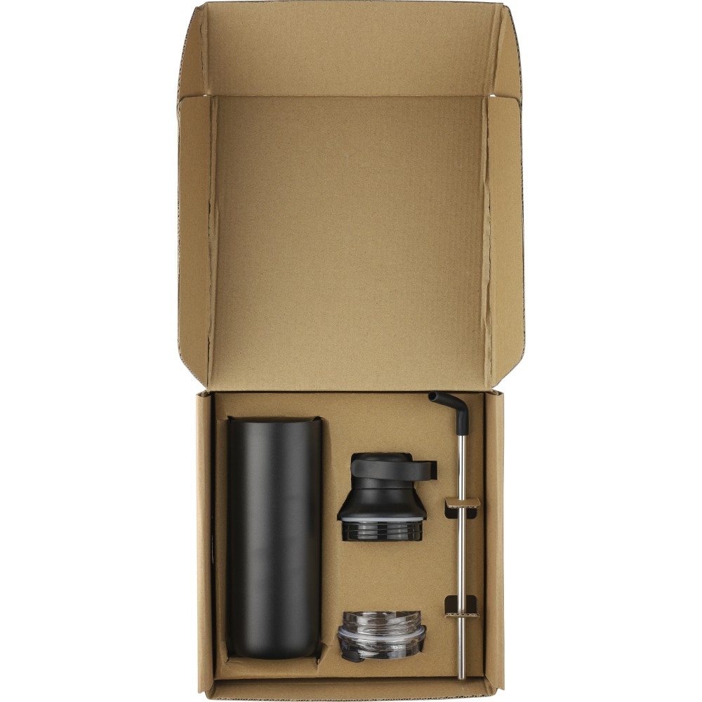 Duplafalú rozsdamentes acél kulacs (500 ml), belső anyaga 304-es rozsdamentes acél, külső része pedig 201-es rozsdamentes acél. Két tetővel szállítjuk: egy hordozófüles PP tetővel és egy átlátszó PS tetővel, amely a mellékelt rozsdamentes acél szívószállal, szilikon véggel és tartóval használható. Egyenként csomagolva, barna kartondobozban. Emblémázás: Bögredekor, Gravírozás, Körszita