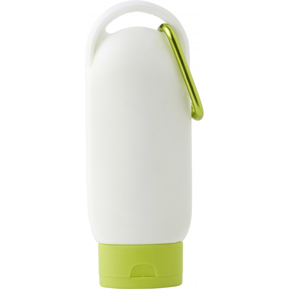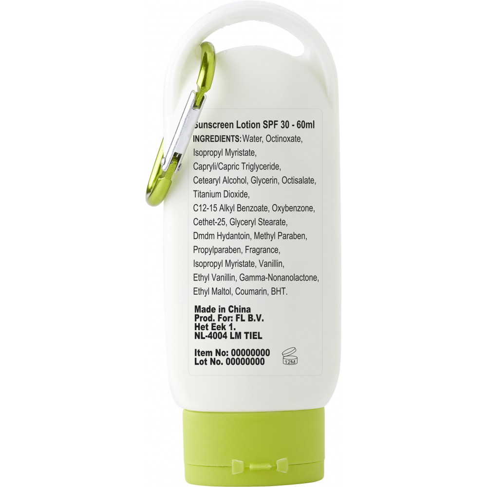 Naptej SPF 30 védelemmel, karabinerrel, színben illeszkedő tetővel. 60 ml. Emblémázás: Matricázás, Tamponnyomás