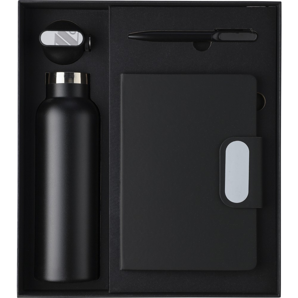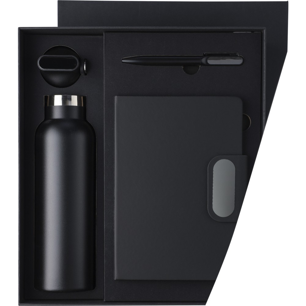 Karton ajándékkészlet duplafalú, újrahasznosított rozsdamentes acél kulaccsal (304 belül és kívül) szilikon fogantyúval, újrahasznosított alumínium csavaros golyóstollal (kék tintával), és újrahasznosított PU jegyzetfüzettel. A jegyzetfüzet 80 lapos, 70 g/m2-es vonalas lapokból áll, szalagos könyvjelzőt és fém mágneses zárat tartalmaz fegyveracél gravírozott lemezzel. Minden termék újrahasznosított logóval van ellátva. Emblémázás: Bögredekor, Gravírozás, Matricázás, Szitanyomás, Tamponnyomás