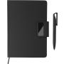 Karton ajándékkészlet. Tartalma: újrahasznosított alumínium csavaros golyóstoll kék tintával és újrahasznosított PU jegyzetfüzet. A jegyzetfüzet 80 lapos 70 g/m2-es vonalas papírral, és szalagos könyvjelzőt és fém mágneses zárat tartalmaz acélszürke gravírozott lappal. Mindkét termék újrahasznosított logóval van ellátva: dombornyomva a jegyzetfüzeten és gravírozva a tollon. Emblémázás: Gravírozás, Szitanyomás