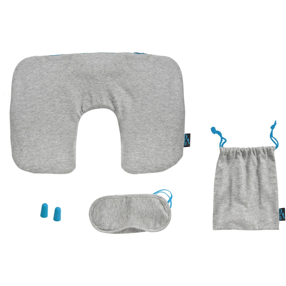 Puha utazó szett. Tartalma: felfújható nyakpárna világoskék cipzárral és levehető huzattal, szemtakaró világoskék gumiszalaggal és világoskék puha füldugó tasak világoskék madzaggal. Emblémázás: Szitanyomás