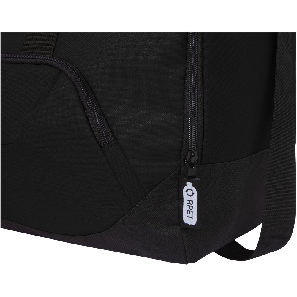 Erős táska 100% -ban újrahasznosított műanyagból, amellyel hozzájárul a műanyag hulladék csökkentéséhez. Nagyméretű fő rekesz és első cipzáras zseb, párnázott vállpánt és párnázott fogantyú. Körülbelül 27 műanyagpalack újrahasznosításával készült. 600D poliészter. Emblémázás: Szitanyomás