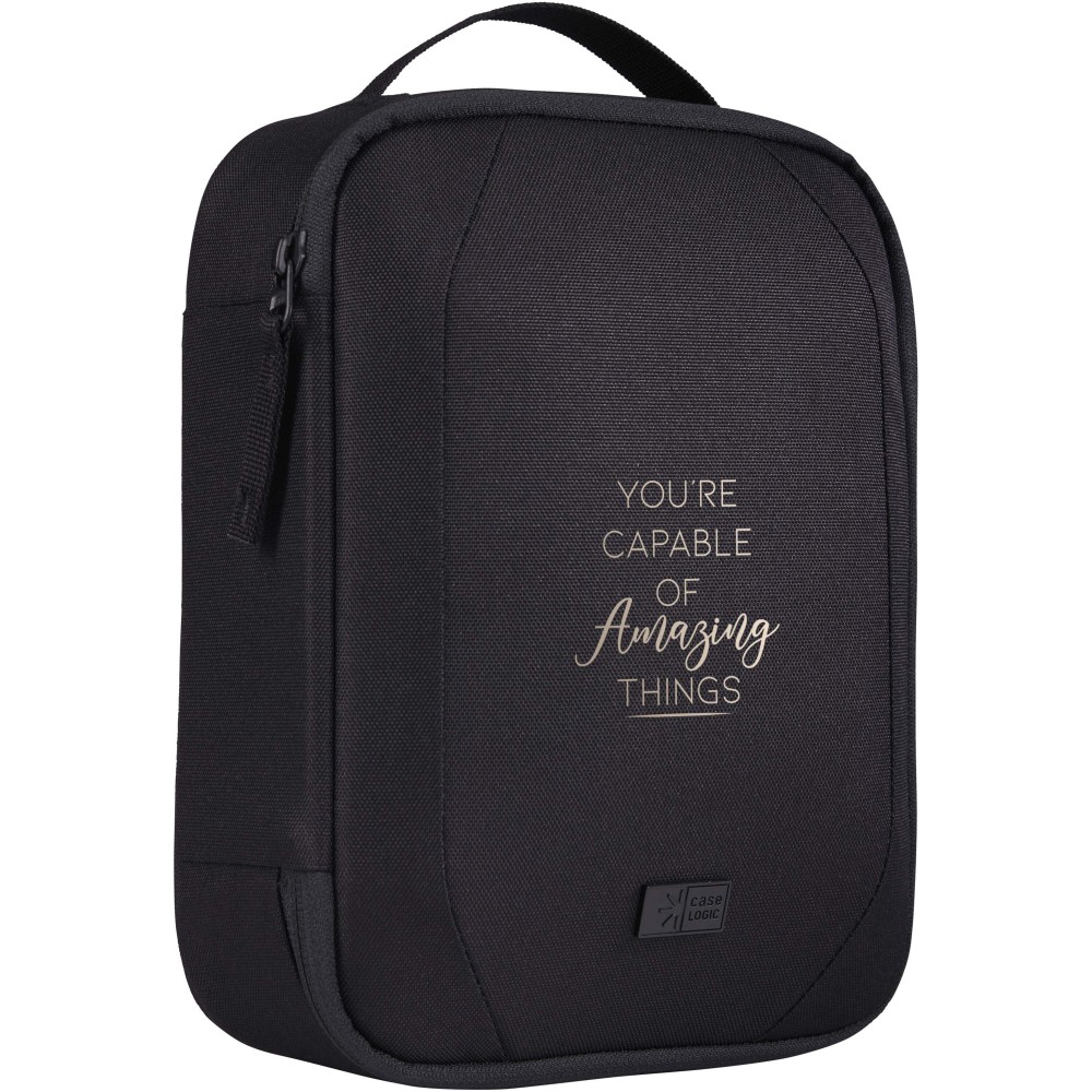 A Case Logic Invigo tartozéktáskában van hely a kábelek, fülhallgatók, adapterek és egyéb személyes tárgyak számára. Nagyszerűen használható egy nagyobb táskában vagy önmagában. Ez a táska 100%-ban újrahasznosított 600D poliészter külsővel és 150D poliészter béléssel készült. Tolltartó zsebbel, cipzáras zsebbel, egy nagy csúszózsebbel és külön tárolórekeszekkel rendelkezik a nagyobb tárgyak, például fejhallgatók számára. Emblémázás: Szitanyomás