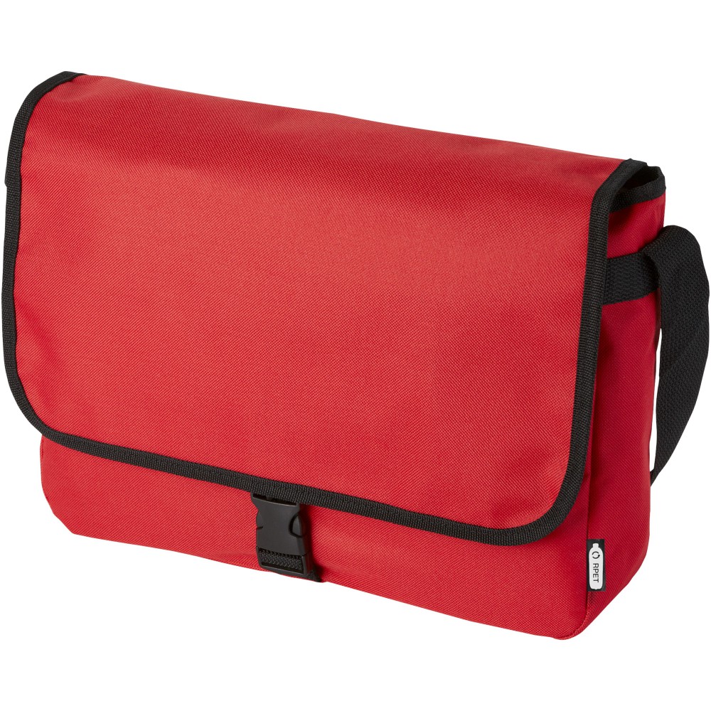 Újrahasznosított PET műanyagból készült válltáska állítható vállpánttal. Egy fő rekesszel, amely fedéllel és csattal záródik. Emblémázás: Szitanyomás