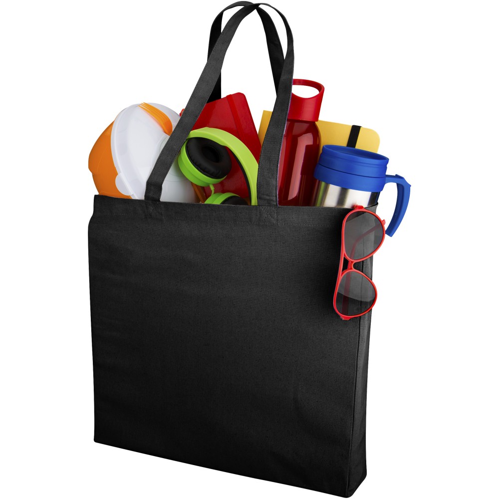Nyitott tetejű táska háromszög alakú oldalbetéttel. A lehajtható fülek magassága 31 cm. 220 g/m2 pamut. Emblémázás: Szitanyomás