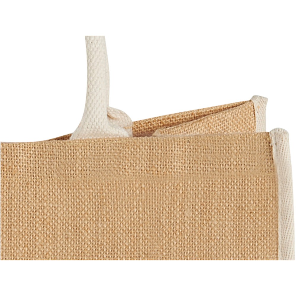 The Large juta bevásárlótáska tépőzáras kialakítással. A lehajtható fülek magassága 17 cm. Megjegyzés: finom grafikát vagy szöveget nem, csak vastag, erős nyomatott lehet az anyagon alkalmazni. Juta. Emblémázás: Szitanyomás