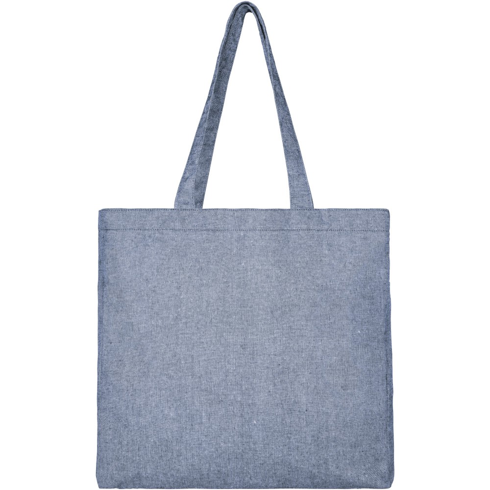 Széles bevásárlótáska 210 g / m2 újrahasznosított pamut poliészter keverékből. Az újrahasznosított pamut textilipari szabászati hulladékból ered. Az újrahasznosított anyag természetéből fakadóan kisebb eltérések lehetnek a színben. Fülmagasság 31 cm. Terhelhető: 10 kg-ig. Újrahasznosított pamut, 210 g/m2, újrahasznosított poliészter. Emblémázás: Szitanyomás