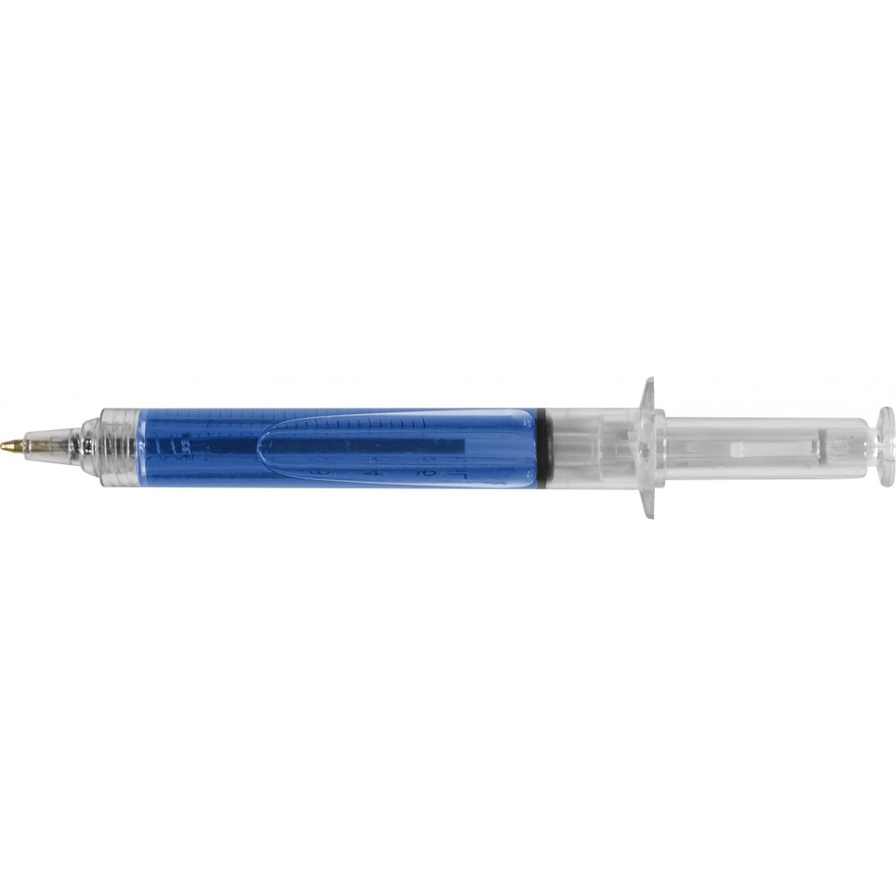 Injekció formájú golyóstoll színes folyadékkal töltve, fekete tollbetéttel. Emblémázás: Tamponnyomás, UV nyomtatás