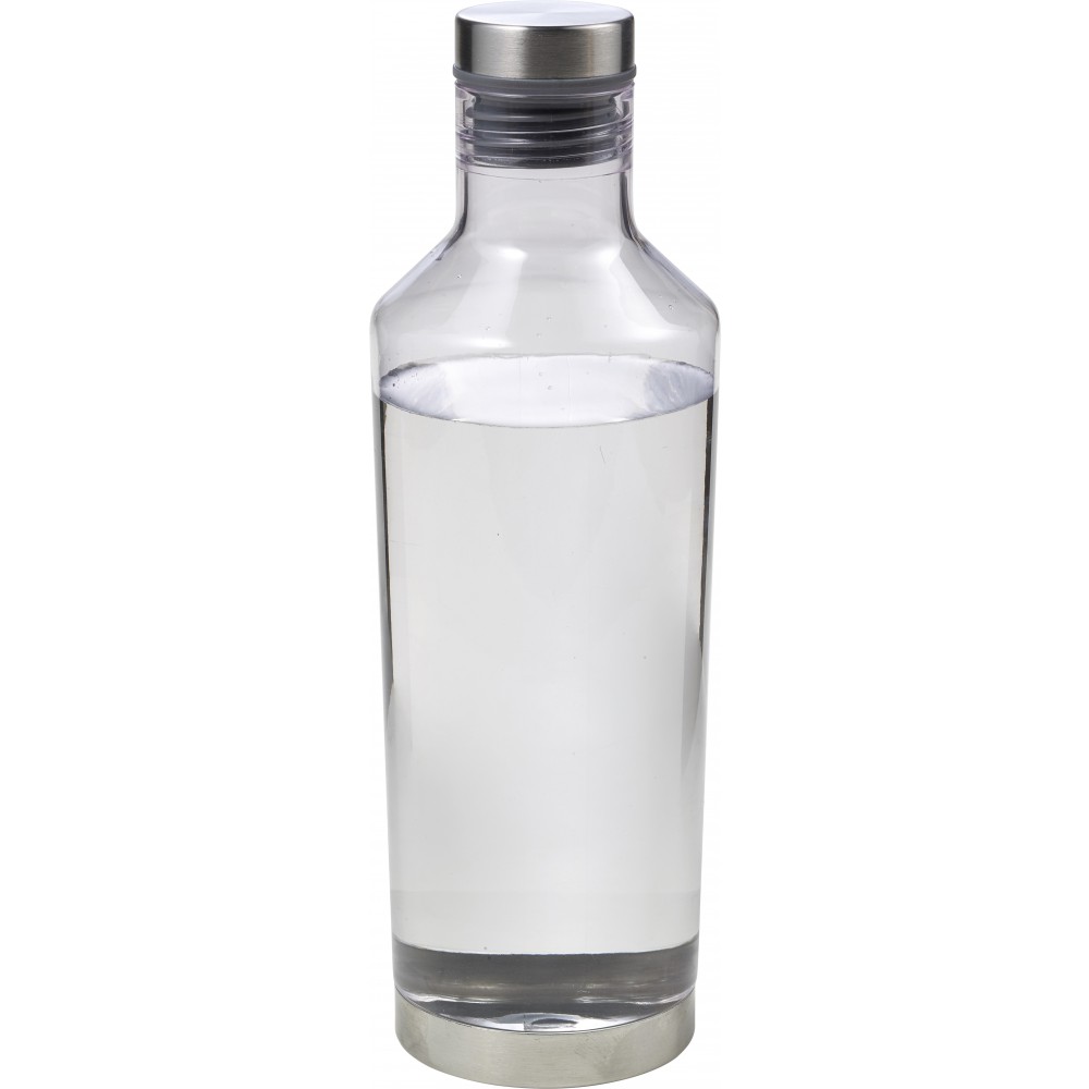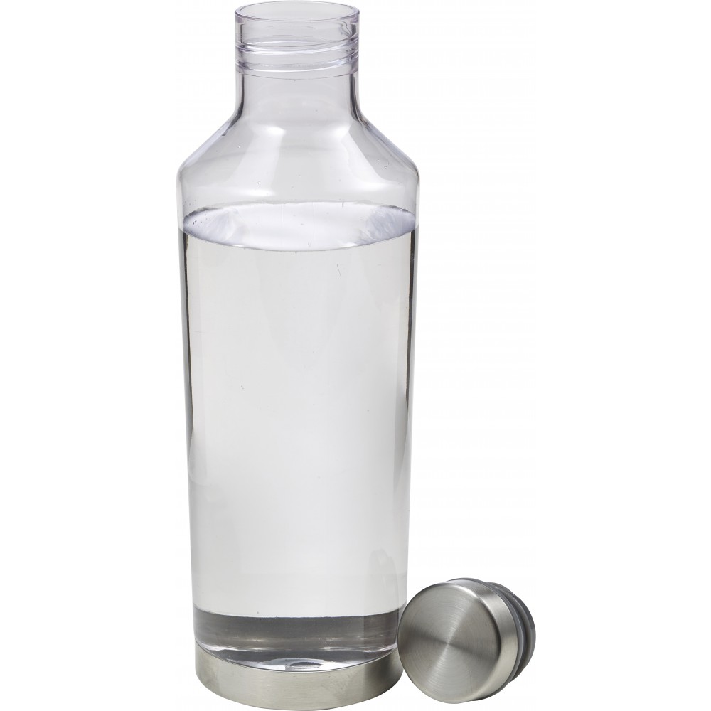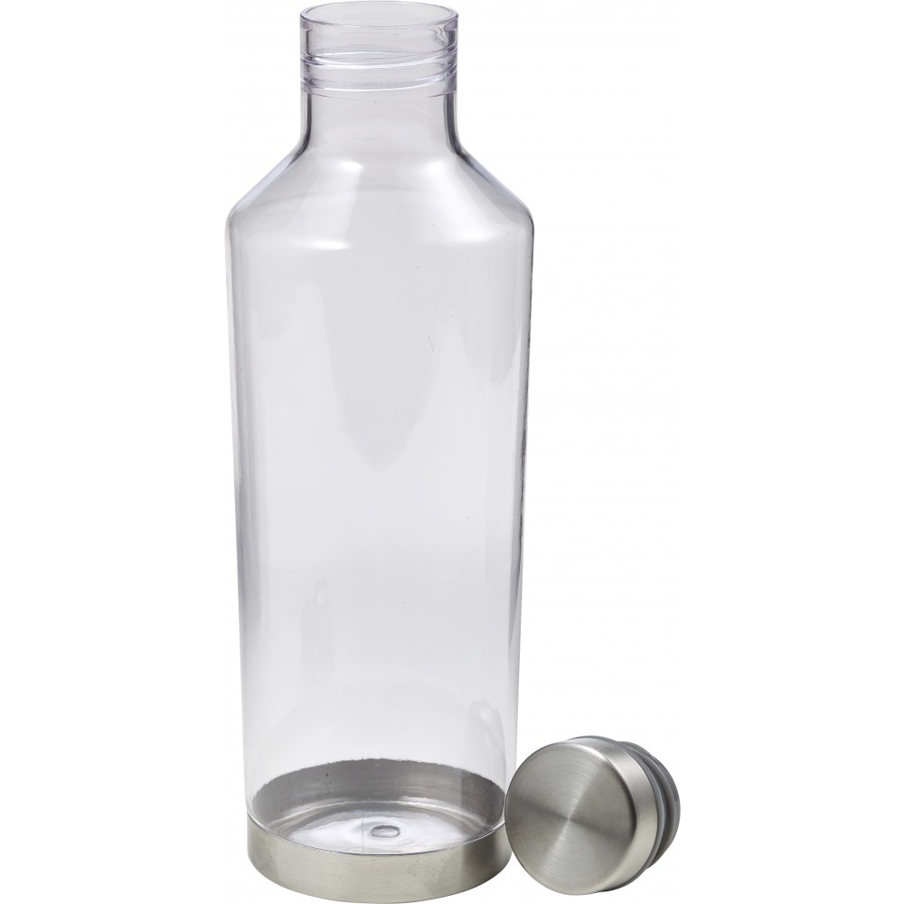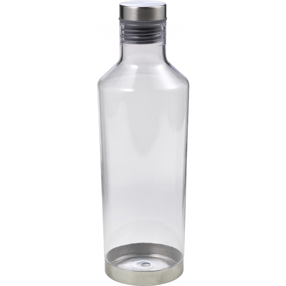 Átlátszó vizespalack fém alsó résszel és fém csavaros kupakkal. A kupak gumigyűrűje színben illeszkedik a palack színével. 850 ml. Nem szivárgásmentes. Mosogatógépben nem tisztítható. BPA-mentes műanyag. Emblémázás: Gravírozás, Körszita, Tamponnyomás