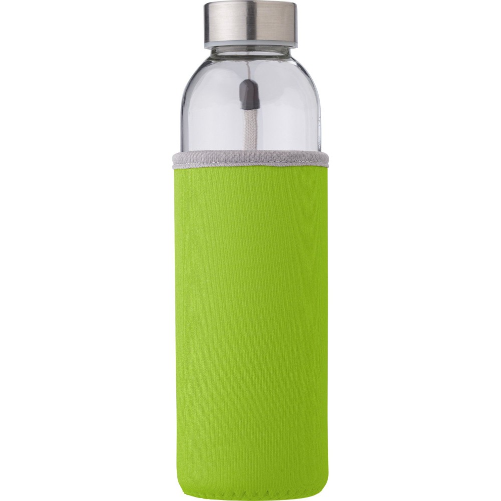 Üvegpalack neoprén tokban, kupakján csuklópánttal. Űrtartalom: 500 ml. Csak hideg italhoz. Nem szivárgásmentes. Mosogatógépben nem tisztítható. Emblémázás: Bögredekor, Gravírozás, Szitanyomás