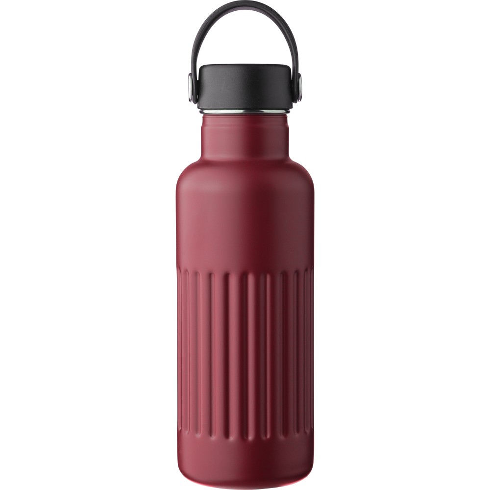 Újrahasznosított rozsdamentes acélból készült, duplafalú ivópalack 500 ml űrtartalommal. Belső része 304-es, külső része 201-es rozsdamentes acél bordázott felülettel. PP és vas kombinációjú kupakkal rendelkezik, TPE hordozópánttal a könnyű szállításhoz. A palacktesten gravírozott recycled (újrahasznosított) alapanyagra utaló logó található. Darabonként barna kartondobozba csomagolva. Emblémázás: Bögredekor, Gravírozás